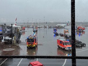 - 消防車に取り囲まれた飛行機