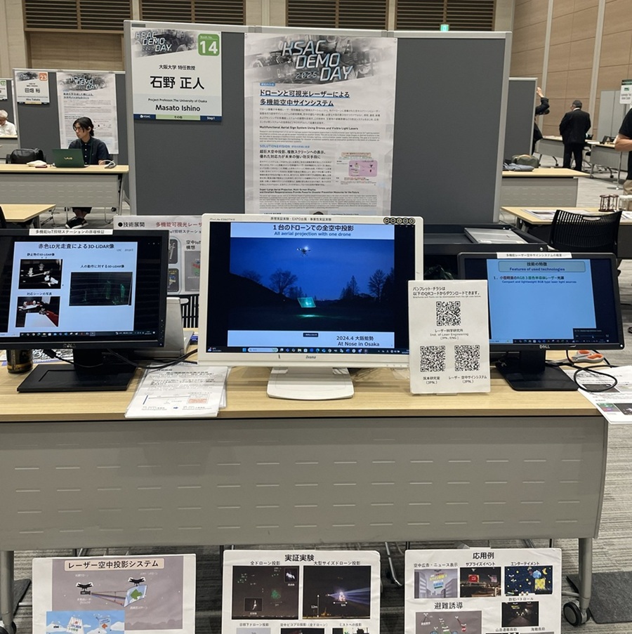 レーザー科学研究所MATグループでは2025年9月20日、「茨城県常総市のきぬ川花火大会」のオープニングでドローンを使ったレーザー空中表示のデモ、また9月18日には大阪梅田グランフロント北館ナレッジキャピタルコングレコンベンションホールで開催されたKSACデモデイ2025で静展示を行いました。