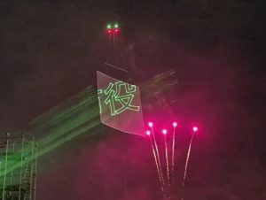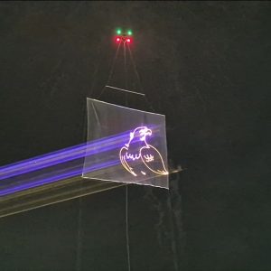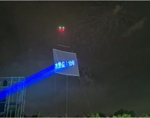 「レーザー空中サインシステム」のデモ飛行は花火大会の本番前の開催セレモニーの時間にプロローグ花火と共演する形で実施しました。地上20m近くのドローンに搭載された大型空中スクリーンに、地上からレーザープロジェクタでメッセージ描画を行いました。描画内容は「常総市制20周年記念」「水害復興10年」「協賛企業紹介」や市制20周年記念ロゴマークや鳥のアニメーション等でありますが、花火との調和を保ちながら高いメッセージ性をアピールでき、セレモニーでの市長挨拶を盛り上げるだけでなく、10万人の参加の1割程度が集まる会場の見学者にレーザー投影の魅力を印象づけることができました。