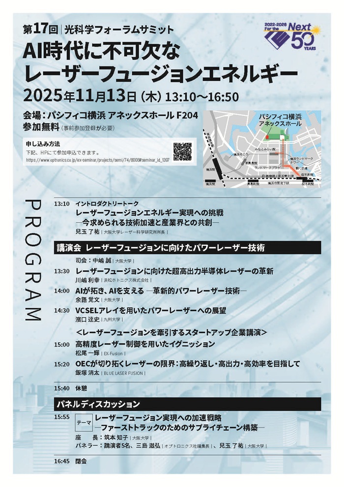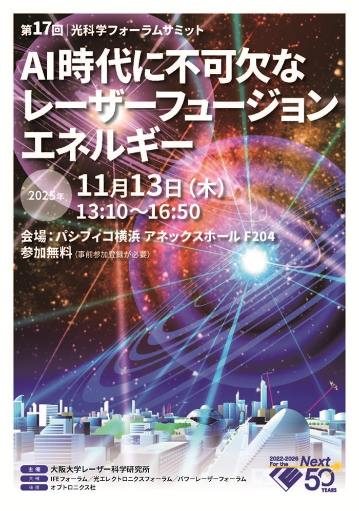 レーザー科学研究所 > イベント > 主催・共催・支援イベント情報 > 第17回光科学フォーラムサミット「AI時代に不可欠なレーザーフュージョンエネルギー」
