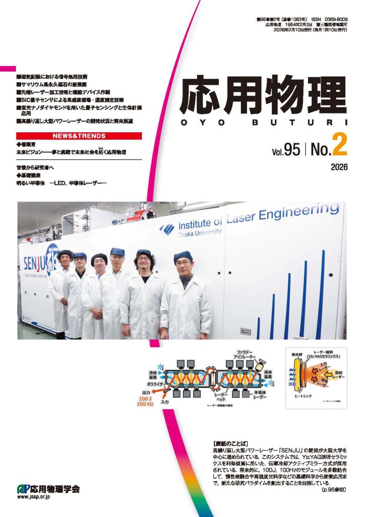荻野純平助教、椿本孝治准教授、吉田英次特任研究員、余語覚文教授による研究紹介記事「高繰り返し大型パワーレーザーの開発状況と将来展望」が、応用物理 第95巻 第2号(2026年2月号)の表紙に選ばれました。