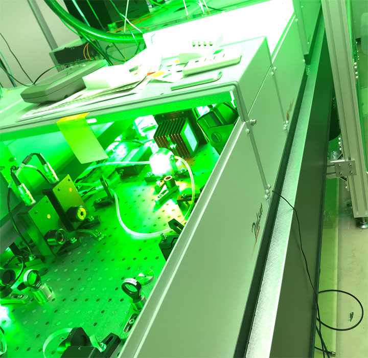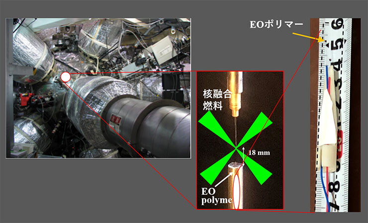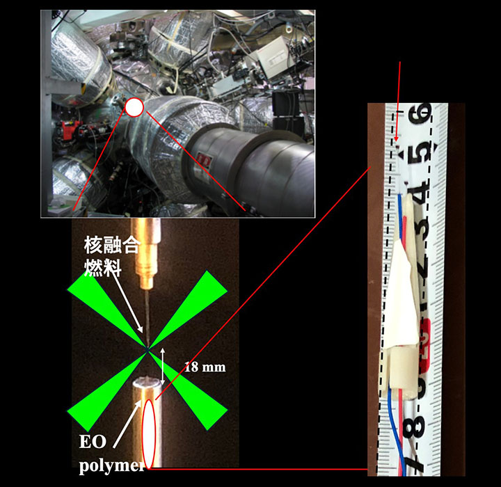 レーザー核融合では核融合反応が始まり、点火して、さらに燃焼に変化する時に、どのように燃え広がるのか、または現状何が原因となって燃え広がらないのかということが解明されていません。我々はそれを実験的に観測し、それらの未解明現象を解明しようとしています。それを測定できるだけの時間・空間分解能が高い核融合中性子計測器の開発を行っています。EOポリマーと呼ばれる材料を用いて世界最高時間分解能ピコ秒の時間分解能を達成しようとしています。この研究には小型の超短パルスレーザー装置も用いており、学生がレーザー装置を自由に触りながら実験を行う環境が整っています。