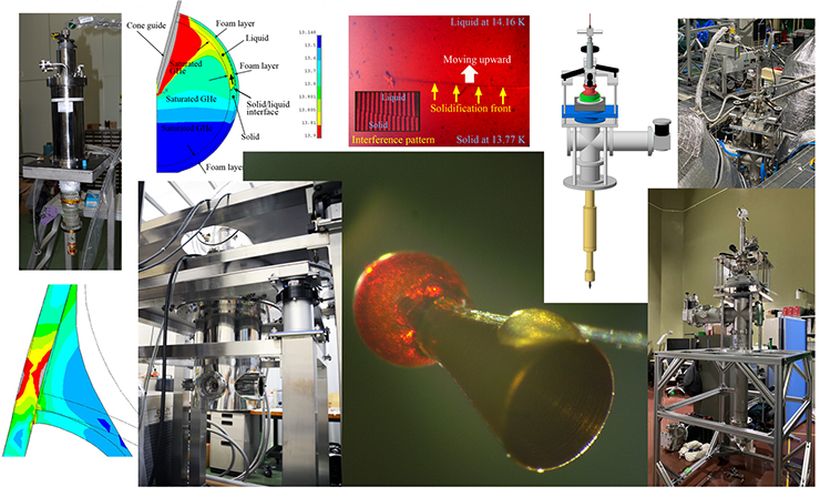 レーザー核融合炉の燃料は、液体または固体状態の水素同位体をプラスチックシェルに入れて供給する必要があります。それをクライオジェニックターゲットと呼んでいます。核融合反応を効率的に起こすためには、シェル内に重水素とトリチウムが均一に入っている必要があります。小型冷凍機を使用して極低温環境(20K付近)を作り、水素同位体燃料の液化や固化実験を行い、均一にするための方法やその均一性の評価手法について研究を行っています。また、固体や液体の状態をシミュレーションにより予測します。
